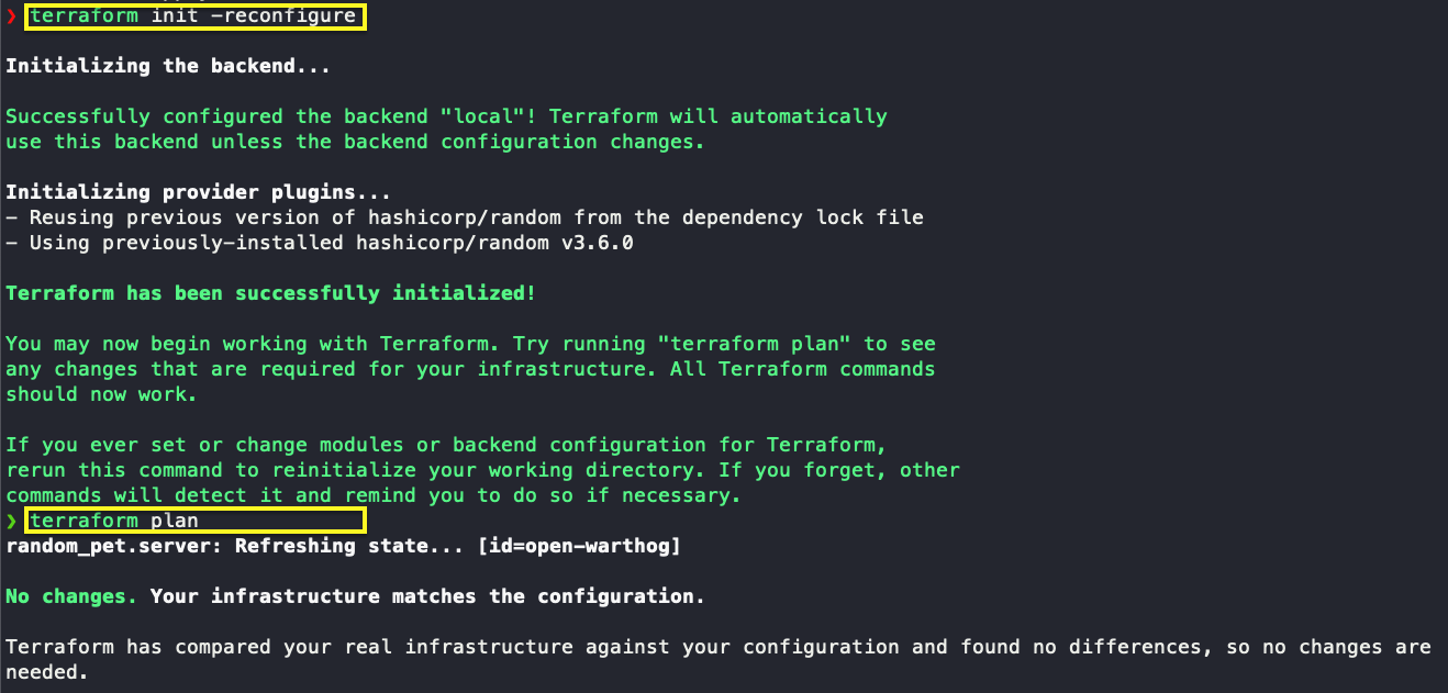 ๋ฐฑ์๋ ๊ตฌ์ฑ์ ๋ค์ "./tfstates/random-pet.tfstate" ๋ก ๋ณ๊ฒฝํ ํ terraform init -reconfigure ๋ฅผ ์งํํ๋ฉด ์ด์ ๋ฆฌ์์ค ์ํ๋ฅผ ์ ์งํ ์ ์์ต๋๋ค.