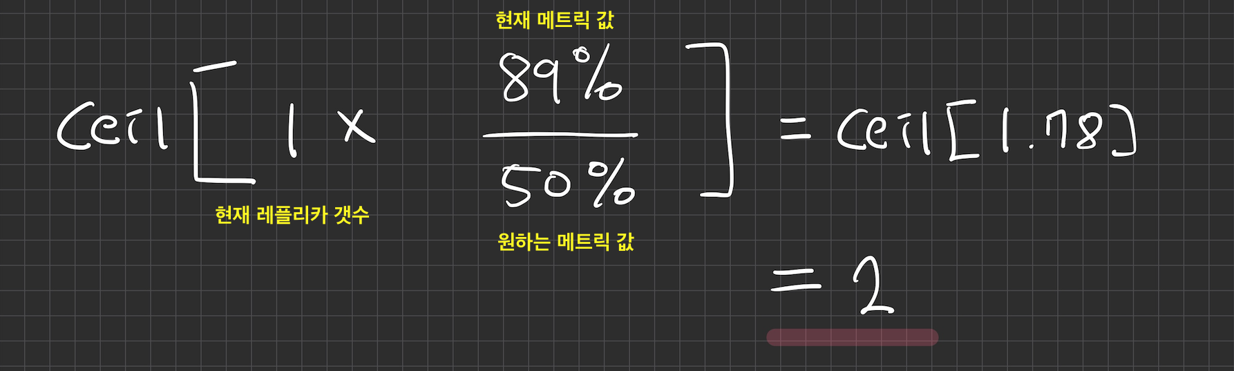 ์ํ๋ ๋ ํ๋ฆฌ์นด ์ = ceil[ํ์ฌ ๋ ํ๋ฆฌ์นด ์ * ( ํ์ฌ ๋ฉํธ๋ฆญ ๊ฐ / ์ํ๋ ๋ฉํธ๋ฆญ ๊ฐ )]