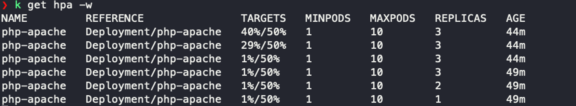 $ kubectl run -i --tty load-generator --rm --image=busybox:1.28 --restart=Never -- /bin/sh -c "while sleep 0.01; do wget -q -O- http://php-apache; done"