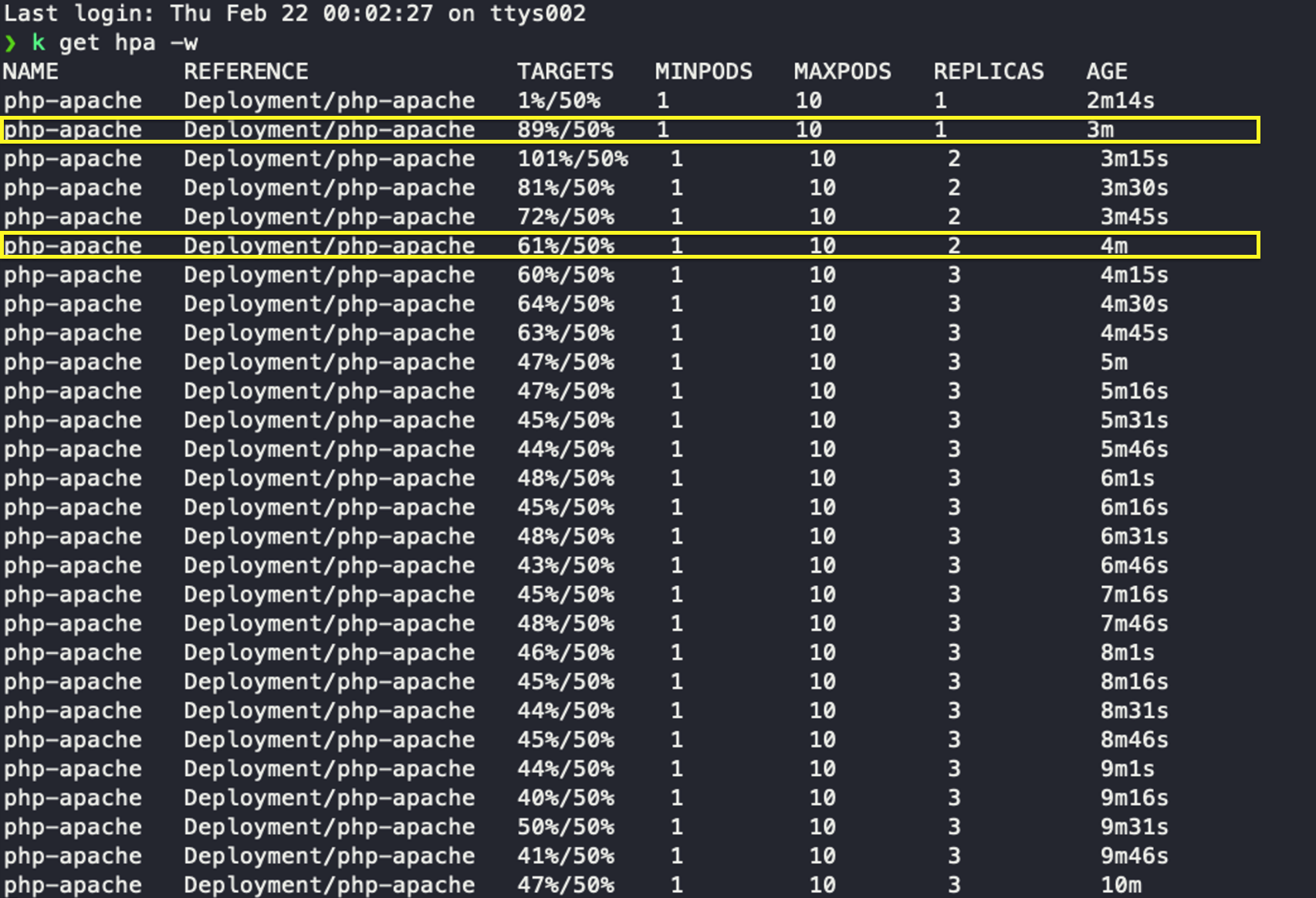 ๊ทธ๋ฆฌ๊ณ 4๊ฐ ์ด์์ ์์ฑ๋์ง ์๋ ๊ฑธ ๋ณด๋ ๋ช ๋ น์ด "while sleep 0.01; do wget -q -O- http://php-apache; done" ์ ์ฒ๋ฆฌํ๋๋ฐ 3๊ฐ์ ํ๋๋ง ์์ผ๋ฉด ์ถฉ๋ถํ๋จ ๊ฑธ ์ ์ ์์ต๋๋ค.