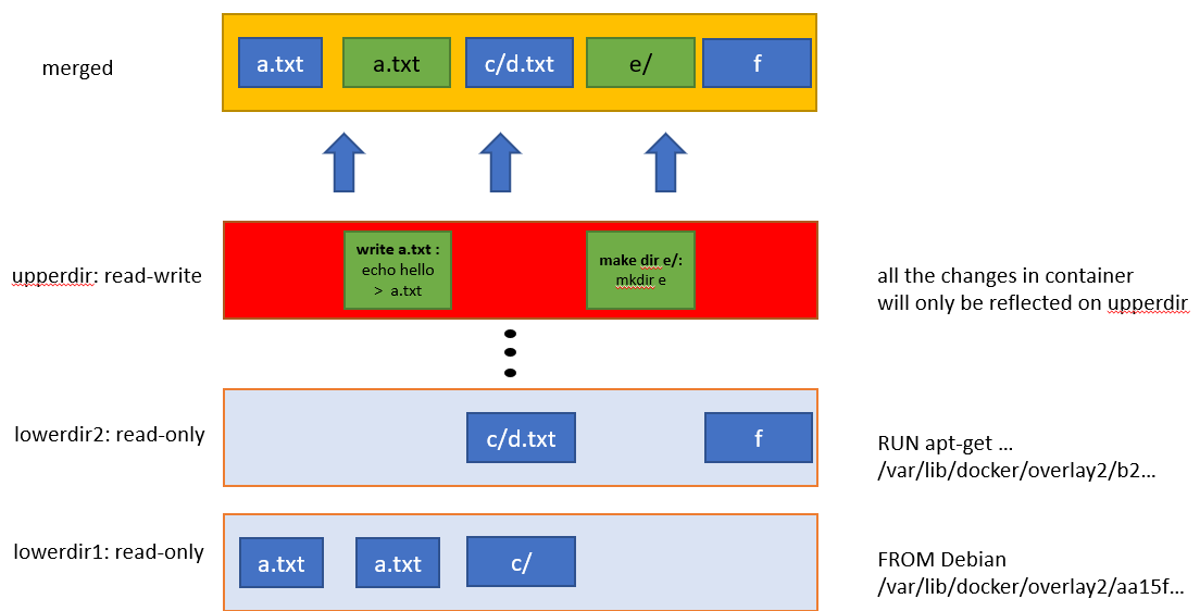 ํฌ๊ฒ lower dir, upper dir, merged dir ๊ฐ ์กด์ฌํฉ๋๋ค.