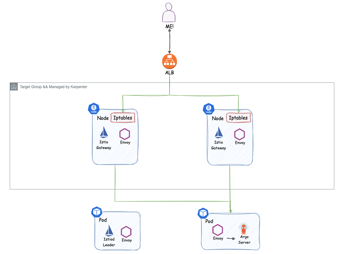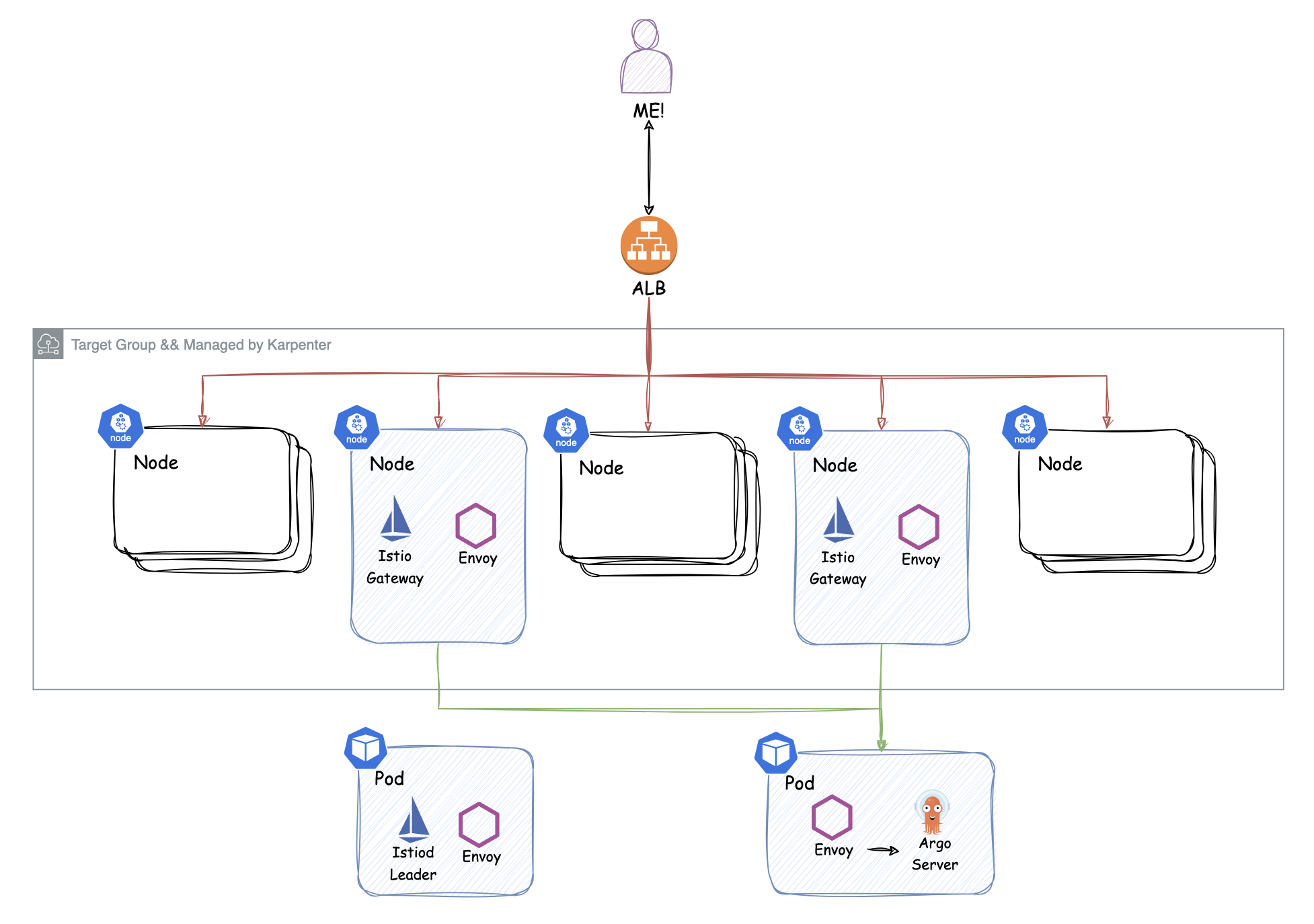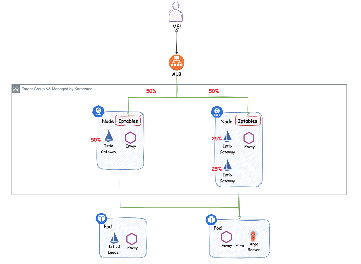 Karpenter ์ ์ํด ๋ ธ๋๊ฐ ์์ฑ๋๊ณ , ์์ฑ๋๋ ๋ ธ๋๋ ๊ตฌ๋ถ์์ด AWS Target Group ์ ๋ฑ๋ก๋๊ธฐ ๋๋ฌธ์ ์๋น์ค๊ฐ ์ฆ๊ฐํจ์ ๋ฐ๋ผ, ๋ ธ๋๋ ์ฆ๊ฐํ๊ณ , ๊ทธ์ ๋ฐ๋ผ Istio Gateway Pod ๊ฐ ์๋ ๋ ธ๋์ ํ๋ฒ์ HIT ํ๊ธฐ๊ฐ ํ๋ค์์ ๊ฒ๋๋ค.