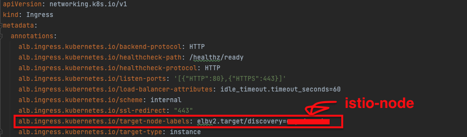 ๊ทธ๋ฆฌ๊ณ AWS LB Controller ์ kind: Ingress ๋ฅผ ์๋์ ๊ฐ์ด ์์ฑํด์ค์ผ๋ก์จ, Istio ๊ฐ ์๋ ๋ ธ๋๋ง Target Group ์ ๋ฑ๋ก์ํฌ ์ ์์ต๋๋ค.