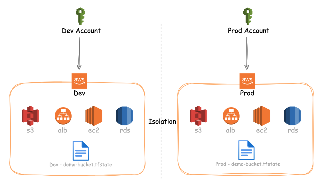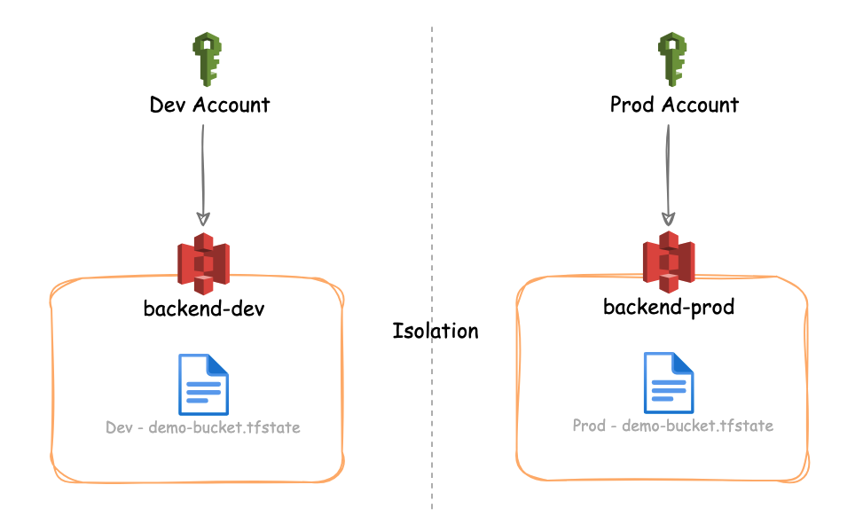 ๊ทธ๋๋ ์ ๋ Dev ํ๊ฒฝ์ ๋ํ tfstate ๋ฉด Dev ๋ฒํท์, Prod ํ๊ฒฝ์ ๋ํ tfstate ๋ฉด Prod ๋ฒํท์ ์๋ ๊ฒ์ด ๋ ๊น๋?ํ๋ค ์๊ฐ ํ๊ณ , ๋ฌด์๋ณด๋ค Prod ํ๊ฒฝ๊ณผ Dev ํ๊ฒฝ์ด ์์ ํ ๊ฒฉ๋ฆฌ๋์ด์ผ ํ๋ ์กฐ๊ฑด์ด ์์๊ธฐ ๋๋ฌธ์ ๋๋์ฑ ๋ถ๋ฆฌํ๋ ๊ฒ์ด ๋ง์์ฃ .