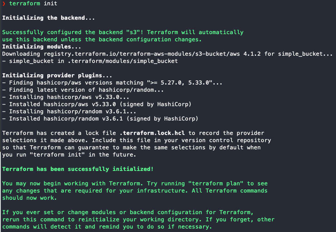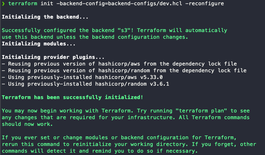 $ terraform init -backend-config=backend-configs/dev.hcl -reconfigure