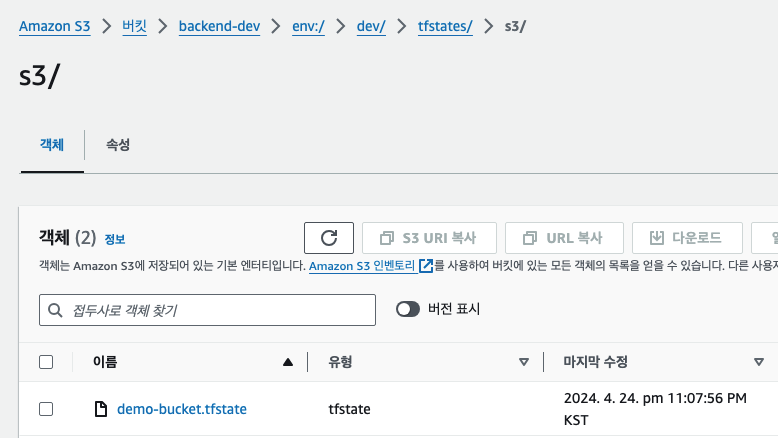 ๊ทธ๋ฐ๋ฐ, ์ฌ๊ธฐ์ ๊ฐ๊ณผํ ๊ฒ์ด ํ๋ ์์ต๋๋ค. S3 ๊ฐ ๋ฐฐํฌ๋๋ ํ๊ฒฝ์ Dev ์ Prod ๊ฐ ๋๋์ด์ก์ง๋ง, tfstate ๊ฐ ์ ์ฅ๋๋ backend ๋ ํ์ฌ Dev ํ๊ฒฝ์ ์๋ "backend-dev" ๋ฒํท์ ๋๋ค.