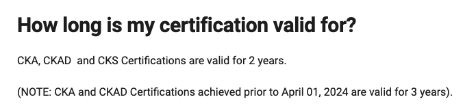 ๊ทธ๋ฆฌ๊ณ ๊ฐ์ฅ ์ค์ํ ์ ํจ๊ธฐ๊ฐ์ธ๋ฐ, ์๋ CKAD , CKA ๋ ์ ํจ ๊ธฐ๊ฐ์ด 3๋ ์ด์๋๋ฐ 24๋ 4์ 1์ผ ์ดํ๋ถํฐ๋ 2๋ ์ผ๋ก ๋ฐ๋์์ต๋๋ค.