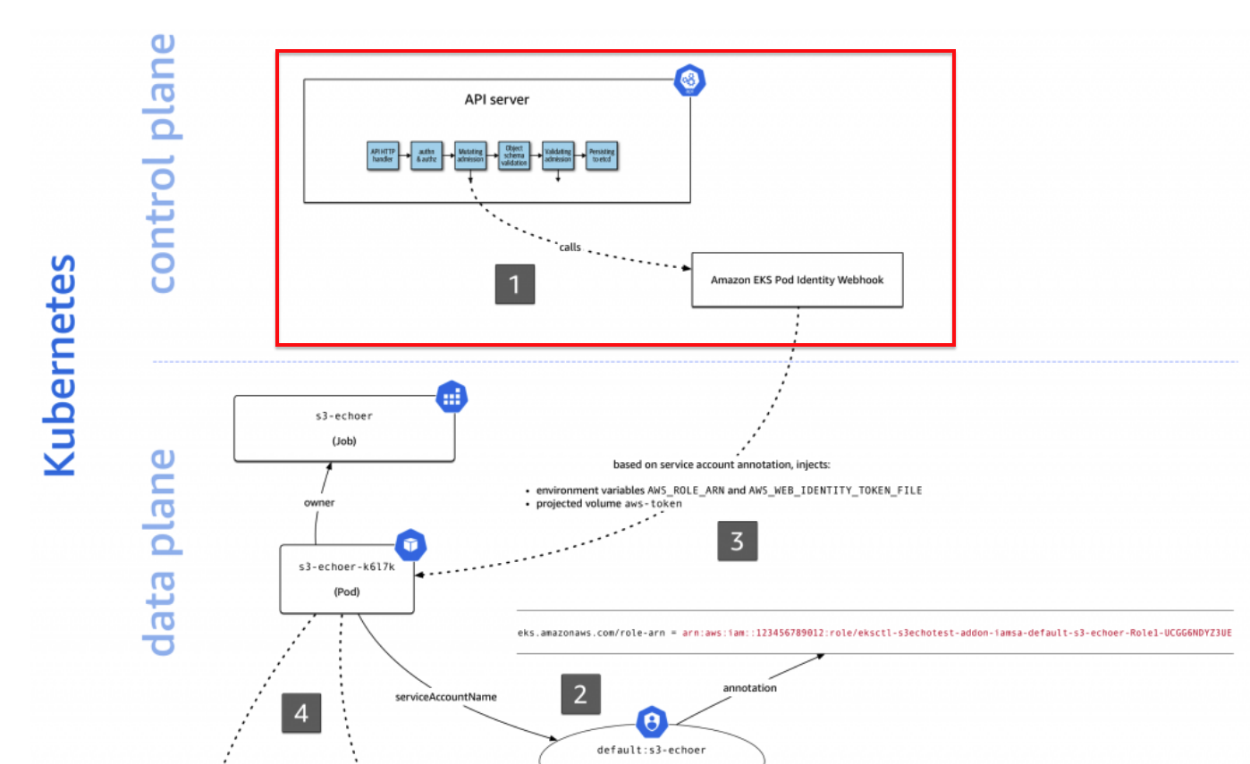 ์ด๊ฑฐ๋ ๋ํผ์ ์ธ๋ฐ, Control Plane ์ amazon-eks-pod-identity-webhook ๋ผ๋ ๋จ๋ ์ ํ๋ฆฌ์ผ์ด์ ์ผ๋ก ์กด์ฌํ๋ ๊ฒ์ผ๋ก ์ถ์ธก๋ฉ๋๋ค. ๊ทธ๋ ๊ธฐ ๋๋ฌธ์ API Server ์์ ๋ก์ปฌ ์ฃผ์์ธ 127.0.0.1:23443 ๋ก ์์ฒญ์ ๋ณด๋ผ ์ ์๋ค๊ณ ์๊ฐํฉ๋๋ค.