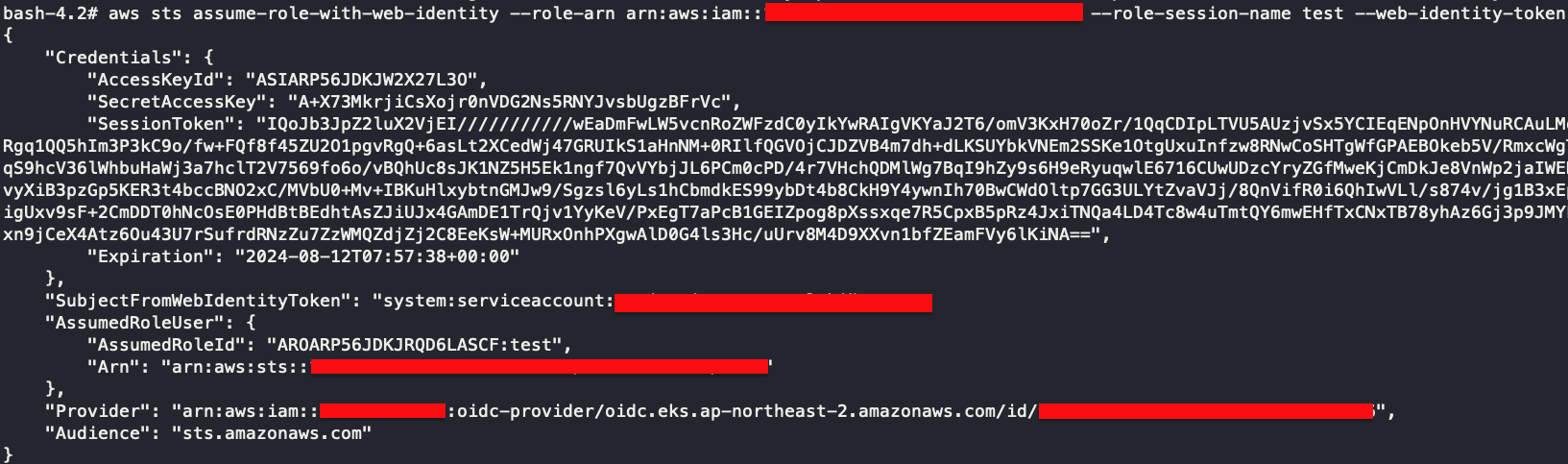 ๋์น๋ฅผ ์ฑ์ จ์ ๋ถ๋ ์์ ์ ์๊ฒ ์ง๋ง, k8s sa token ์ ์ป์ด๋ด๊ธฐ๋ง ํ๋ค๋ฉด ๋ง๋ฃ๋๊ธฐ ์ ๊น์ง ์ด๋์๋ ํด๋น k8s sa token ์ ํตํด AWS Session Token ์ ์ป์ ์ ์์ต๋๋ค.