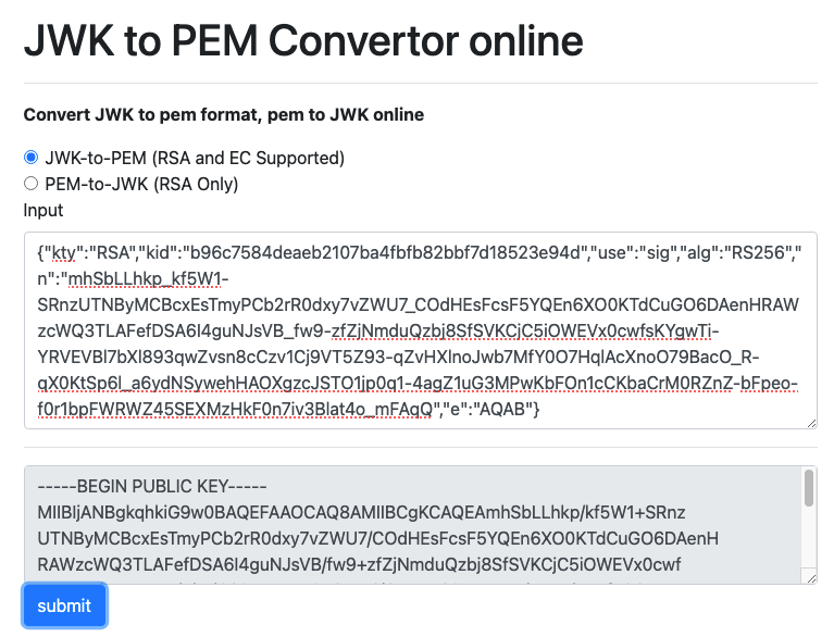 ๊ทธ๋ผ JWK ์ ์ป์ ์ ์์ฃ . ์๋ง์ key ์ค ํ๋๋ฅผ ์ ํํ ํ PEM ์ผ๋ก ๋ณํํด์ค๋๋ค!