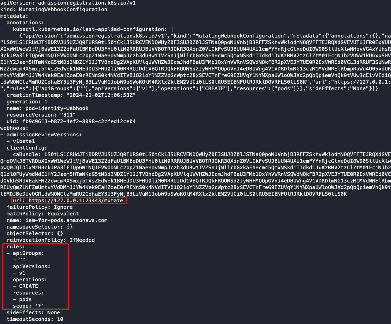 ์ฌ๊ธฐ์ https://127.0.0.1:23443/mutate ์ amazon-eks-pod-identity-webhook ์ ์๋ํฌ์ธํธ๋ฅผ ๊ฐ๋ฆฌํค๋ ๊ฒ ๊ฐ์๋ฐ, kubectl get ์ผ๋ก ๋ณด์ด์ง ์๋ ๊ฒ์ผ๋ก ๋ณด์ ์ฟ ๋ฒ๋คํฐ์ค ์์ ์๋๊ฑฐ ๊ฐ์ง ์์ต๋๋ค.