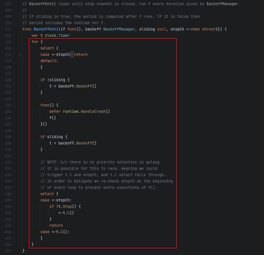 - wait.Until() ๋ฅผ ํ๊ณ , ํ๊ณ ๋ค์ด๊ฐ๋ฉด ๊ฒฐ๊ตญ BackoffUntil ์ด๋ผ๋ ํจ์๊ฐ ๋์ค๊ฒ ๋ฉ๋๋ค. ๋ฌธ์ ๊ฐ ์๊ฒผ์ ๊ฒฝ์ฐ ๋ฐ๋ก ์ข ๋ฃํ๋๊ฒ ์๋๊ณ , Backoff ์ ์งํํด์ ๊ณ์ ๋ฌธ์ ๋ฅผ ํด๊ฒฐํ๋ ค๊ณ ๋ ธ๋ ฅํ๋ ๊ฑฐ์ฃ .