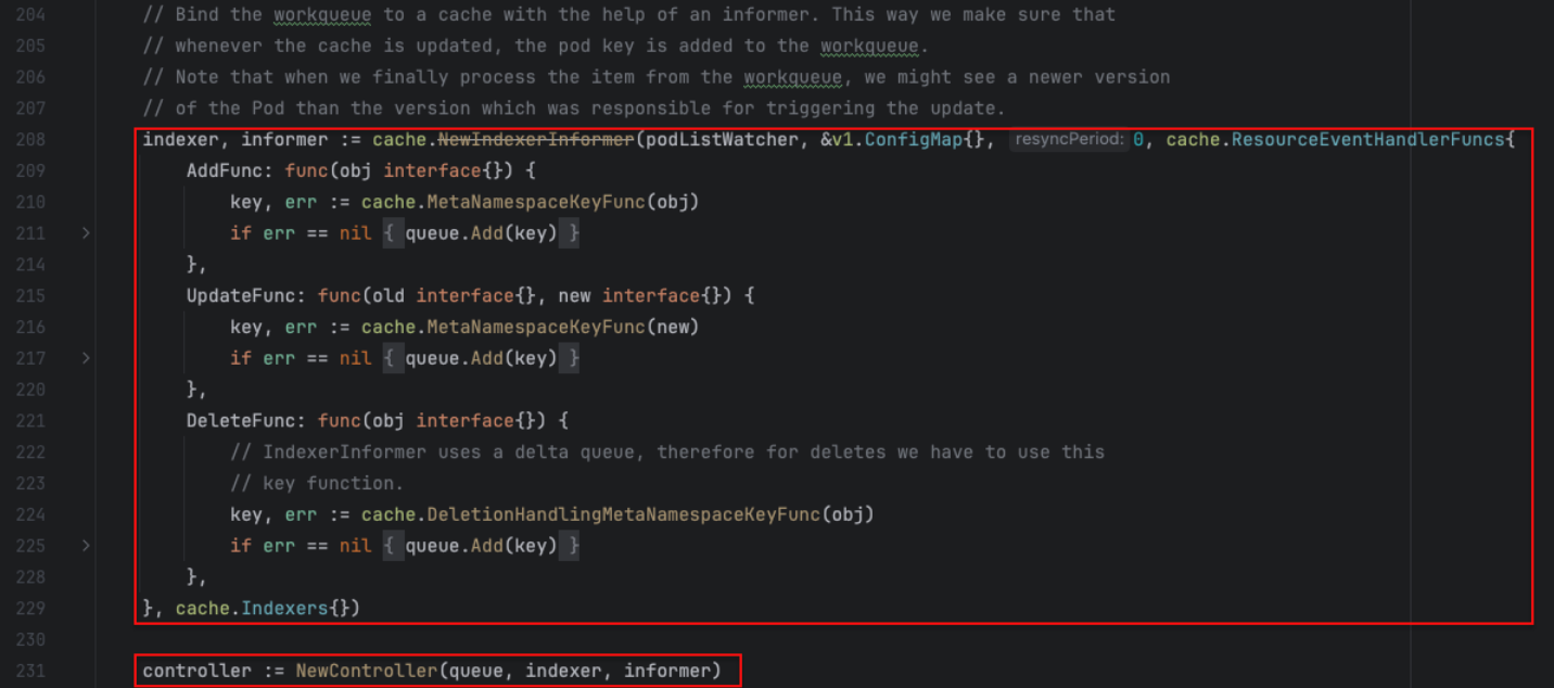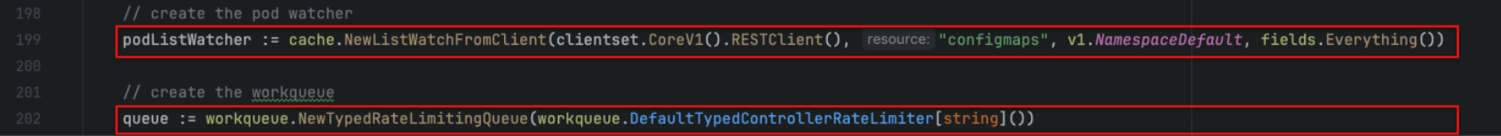 - WorkQueue ๊ฐ์ฒด๋ฅผ ์์ฑํฉ๋๋ค, ๋ค์ ์์ Informer ์ ํ์ํฉ๋๋ค.