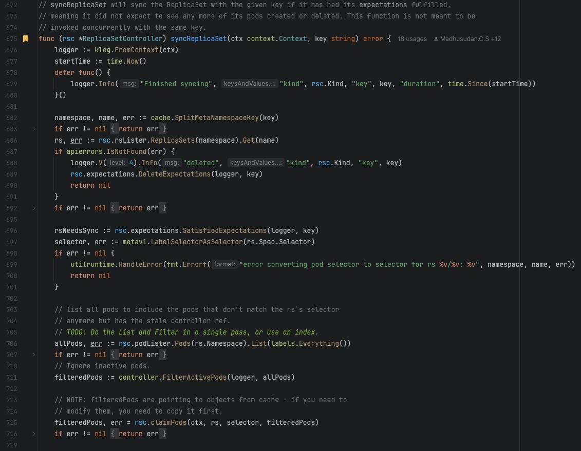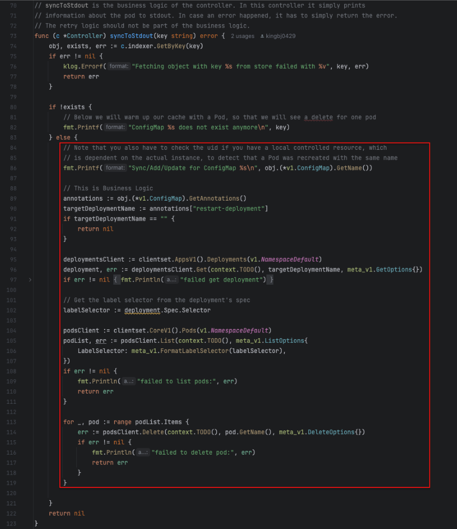 - c.syncToStdout(key) ๋ Reconciliation ์ Analyze ์ Act ์ ๊ดํ ๋น์ฆ๋์ค ๋ก์ง์ ๊ตฌํํ๋ ํจ์์ ๋๋ค. (syncToStdout ๋ผ๋ ์ด๋ฆ ๋ง๊ณ ๋ค๋ฅธ ์ด๋ฆ์ผ๋ก ์ง์ด๋ ์ ํ ์๊ด ์์)