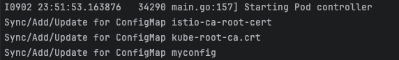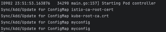 ๊ทธ๋ฌ์ Controller ์์ Sync/Add/Update for ConfigMap myconfig ๋ก๊ทธ๊ฐ ํ๋ ๋ ์ฐํ๊ฑธ ํ์ธํ ์ ์์ฃ .