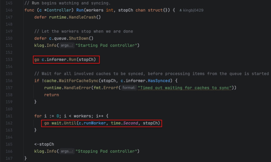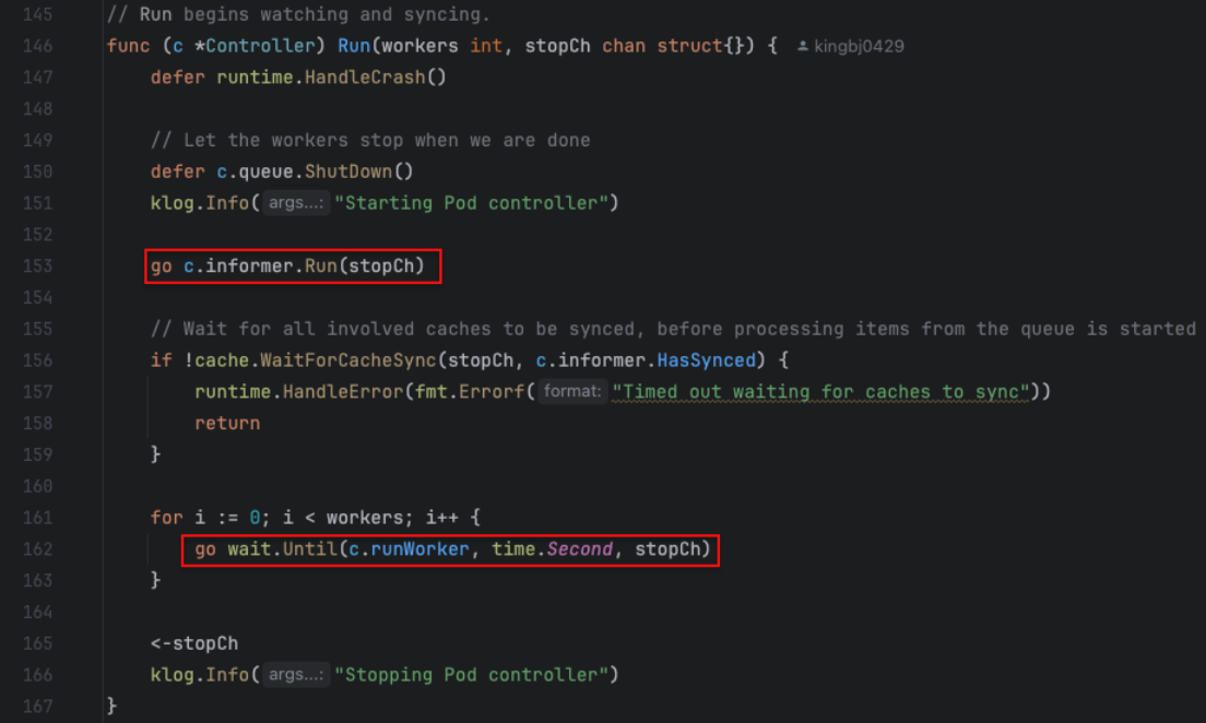 - c.runWorker ๋ํ wait.Until ๊ณ ๋ฃจํด์ ํตํด ์คํ๋ฉ๋๋ค.