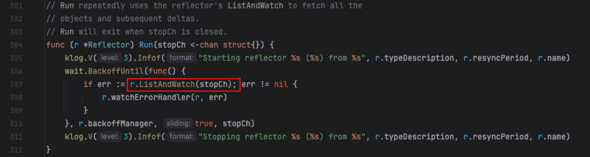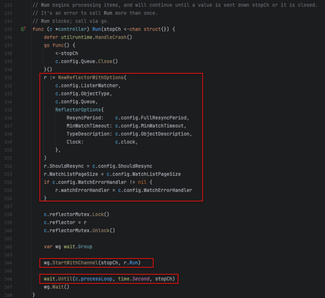 - informer.Run ์ ๊ณ ๋ฃจํด์ผ๋ก ์คํํฉ๋๋ค. ๋ค์์ ์ดํด๋ณด๊ฒ ์ง๋ง, stopCh ์ด close ๋ ๋๊น์ง ListWatch ๋ฅผ ํตํด ๋ฌดํ์ผ๋ก(Control Loop) ์ฟ ๋ฒ๋คํฐ์ค์ ๋ฆฌ์์ค๋ฅผ ์ฃผ์(Watch) ํฉ๋๋ค.