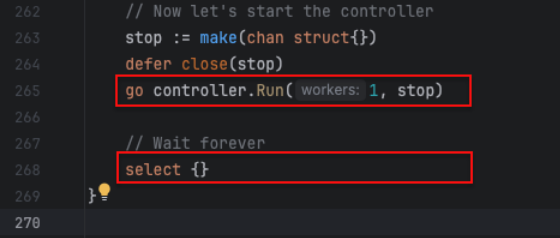 - ์์์ ์์ฑํ Controller ๊ฐ์ฒด๋ฅผ ์คํํฉ๋๋ค. ๋ค์ ์๋ workers ๋ Reconciliation ์ 2๋ฒ์งธ ๋จ๊ณ์ธ Analyze ์ 3๋ฒ์งธ ๋จ๊ณ์ธ Act ๋ฅผ ์ํํ ๋ ์ฒ๋ฆฌํ ๋ณ๋ ฌ ๊ฐฏ์์ ๋๋ค.