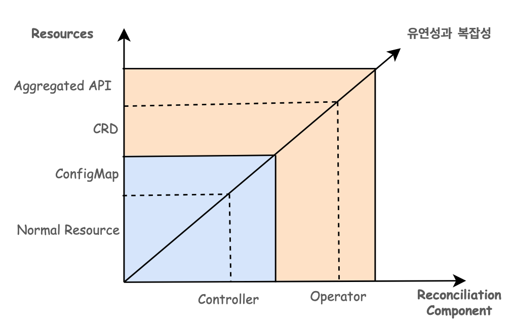 ์ฌ์ค ์ด ๋ ๋ ์์ ํ์๊ฐ ๊ต์ฅํ ๋น์ทํ๊ธฐ ๋๋ฌธ์ ๋ช ํํ๊ฒ ๋์ ์ฐจ์ด๋ฅผ ์ค๋ช ํ๊ธด ํ๋ค์ง๋ง, ๋ณดํต CRD(CustomResourceDefinition) ๋ฅผ ํตํด Reconciliation ๋ฅผ ์ํํ๋ค๋ฉด Operator, CRD ์์ด ์ฟ ๋ฒ๋คํฐ์ค ๋ฆฌ์์ค๋ก๋ง ์งํ๋๋ Reconciliation ๋ผ๋ฉด Controller ๋ผ๊ณ ๋ถ๋ฆ ๋๋ค.