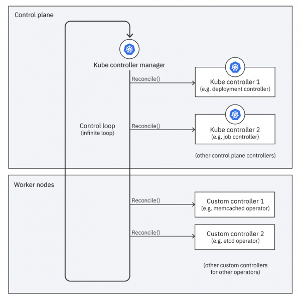 Controller Manager ์์์ Control Loop ์ ํตํด ๋ฌดํํ ๊ด๋ จํ ๋ฆฌ์์ค๋ฅผ ์ฃผ์(Watch) ํ๊ณ ์๊ณ , ๋ง์ฝ ์ฐจ์ด๋ฅผ ๋ณด์ด๋ ๋ฆฌ์์ค๊ฐ ์๋ค๋ฉด Reconcile(๋ฆฌ์ปจ์ฌ์ผ) ์ ํตํด์ ์๋ก์ ์ํ๋ฅผ ๋ง์ณ์ค๋๋ค.
