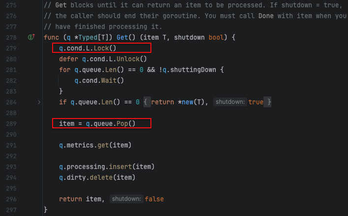 ์์ !! ์ค์ง์ ์ผ๋ก ๊ณ ๋ฃจํด์ ๋ธ๋กํ๋ ๊ฑด for q.queue.Len() == 0 && !q.shuttingDown {} ๋ด์ ์๋ q.cond.Wait() ์ ๋๋ค.
