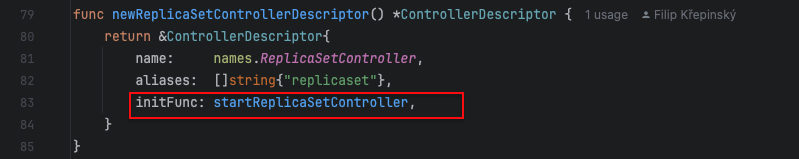 newReplicaSetControllerDescripto() ๋ฅผ ํตํด ReplicaSet ์ ๊ดํ ControllerDescriptor ๊ฐ์ฒด๋ฅผ ์์ฑํฉ๋๋ค.