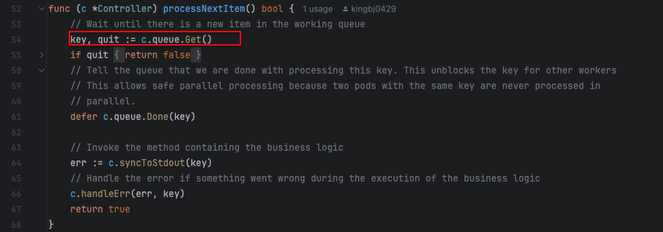 ๊ทธ๋ฆฌ๊ณ go wait.Until(c.runWorker, time.Second, stopCh) ์ ์ํํ๋๋ฐ c.runWorker ํจ์ ์์ ๋ณด๊ฒ๋๋ฉด processNextItem ์ด ์คํ๋๊ณ processNextItem ์์๋ c.queue.Get() ์ ํ๊ฒ ๋ฉ๋๋ค.