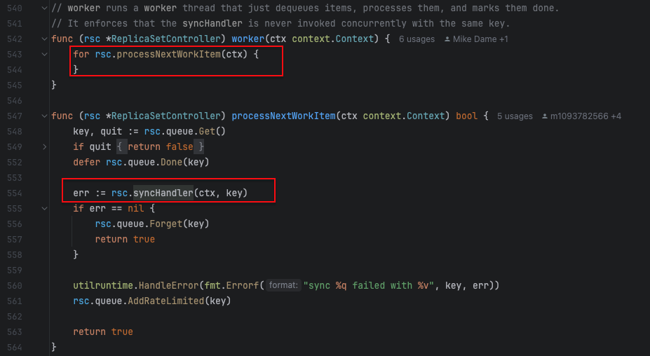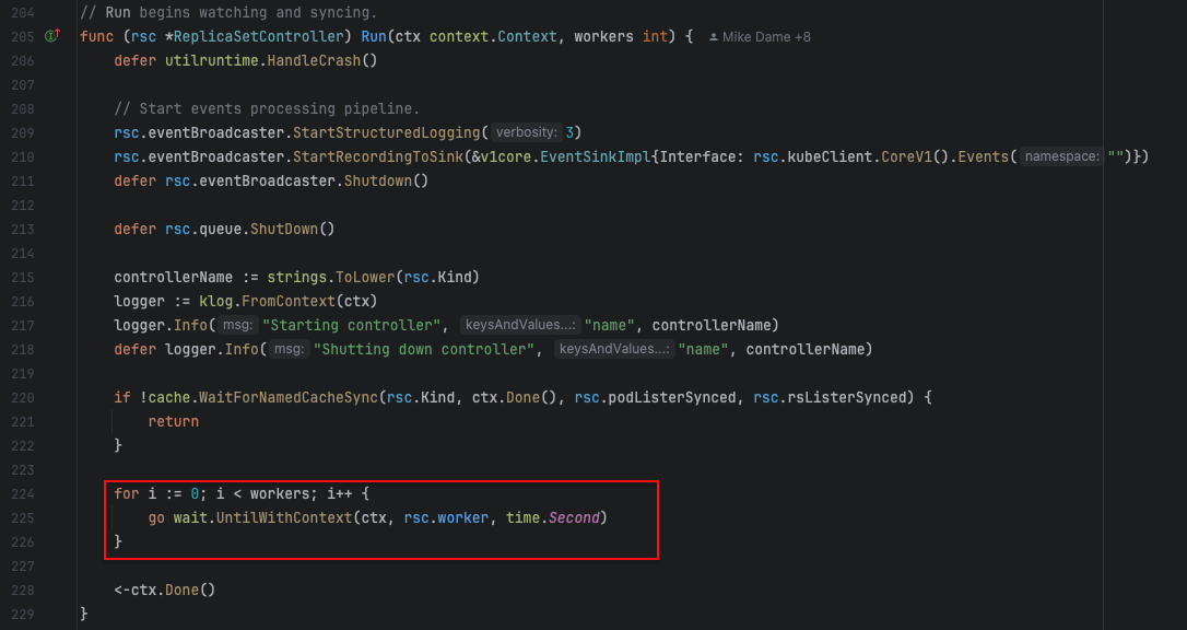 ์ฌ๊ธฐ์๋ถํฐ๋ ์์ ์ ํฌ๊ฒ ๋ค๋ฅผ ๋ฐ๊ฐ ์์ต๋๋ค. go wait.UntilWithContext ํจ์๋ฅผ ํตํด์ rcs.worker ๋ฅผ ์คํํฉ๋๋ค.