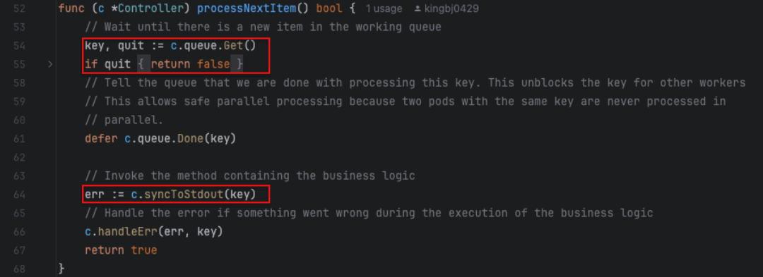 - ์์ informer ๊ฐ์ฒด๋ฅผ ์์ฑํ ๋ Add/Update/Delete ์ด๋ฒคํธ๊ฐ ๋ฐ์ํ์ ๋ queue.add(key) ๋ฅผ ํตํด key ๋ฅผ ๋ฃ์ด์คฌ๋๋ฐ, ์ด๋ฒ์ Get() ์ ํตํด key ๋ฅผ ๊ฐ์ ธ์ต๋๋ค. (Get() ํจ์ ์์๋ pop() ์ด ์์) ๊ทธ๋ฆฌ๊ณ ์ด queue ๊ฐ ๋น์ด์๋ ์ํ๋ผ๋ฉด false ๋ฅผ ๋ฆฌํดํจ์ผ๋ก์จ c.processNextItem() ์ ์ข ๋ฃํฉ๋๋ค.