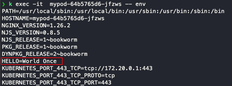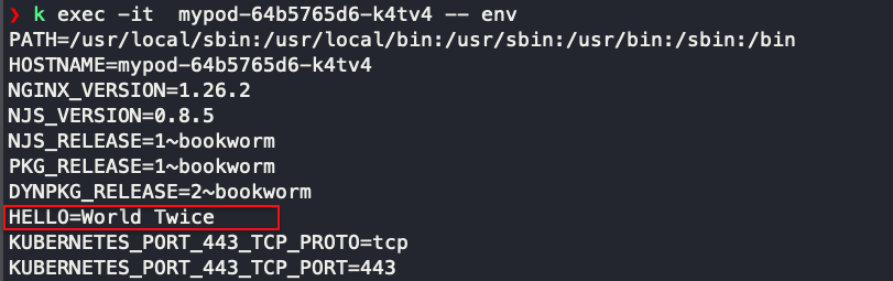 ๊ทธ๋ฆฌ๊ณ ํ์ฌ ๋ฐฐํฌ๋์ด์๋ Deployment ์ Pod ์๋ myconfig ๊ฐ ๊ฐ์ง๊ณ ์๋ ๋ฐ์ดํฐ๊ฐ์ ํ๊ฒฝ๋ณ์๋ก ๋ค๊ณ ์์ต๋๋ค.