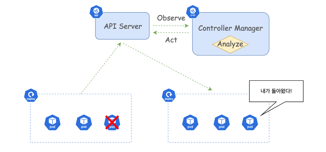 ๊ด์ฐฐ(Observe) ํ๊ณ ์๋ ๋ฆฌ์์ค์ ์ํ๊ฐ ๋ณ๊ฒฝ๋ ๋ Controller Manager ๋ ๊ด๋ จํ ์ด๋ฒคํธ๋ฅผ ์ฃผ์(Watch) ํ์ฌ ์ค์ ์ํ(Lived State) ๋ฅผ ์ฐพ์, ์ํ๋ ์ํ(Desired State) ์ ์ฐจ์ด๋ฅผ ๋ถ์(Analyze) ํ๊ณ , ์ํ๋ ์ํ๋ก ๊ตฌ๋๋๋๋ก ์์ ์ ์ํ(Act) ํฉ๋๋ค.