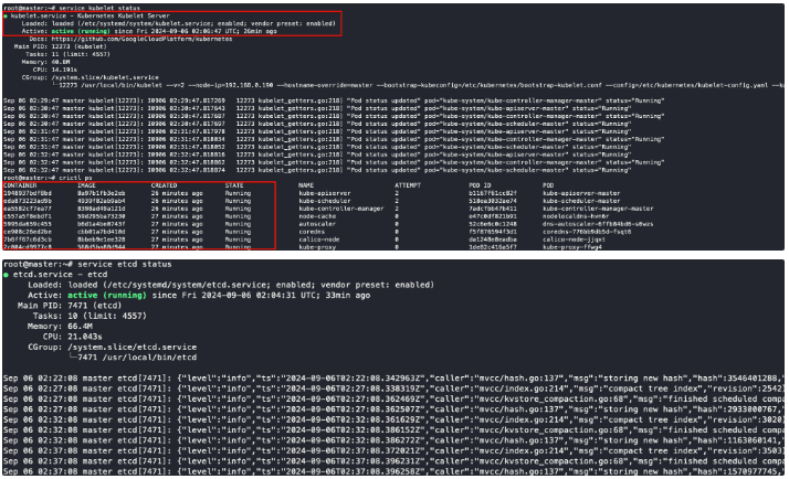 crictl ๋ช ๋ น์ service ๋ช ๋ น์ด๋ฅผ ํตํด kubelet, etcd, container ์ ์ํ๋ ํ์ธํด์ค๋๋ค.