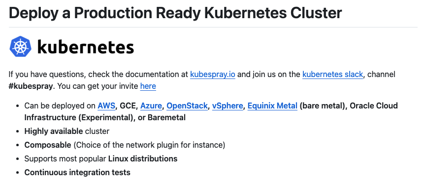 Kubespray ์ ์ด์ฉํ๋ฉด ์์ฃผ ์ฝ๊ฒ ์ฟ ๋ฒ๋คํฐ์ค๋ฅผ ์ค์นํ๊ณ ๊ด๋ฆฌ ํ ์ ์์ต๋๋ค. ๋ฌผ๋ก ์ค์๋ธ๋ก ์งํ๋๊ธด ํ์ง๋ง, ์ค์๋ธ์ ๊ทธ๋ ๊ฒ ์ด๋ ต์ง ์์์ ์ฝ๊ฒ ํ์ค ์ ์์ต๋๋ค.