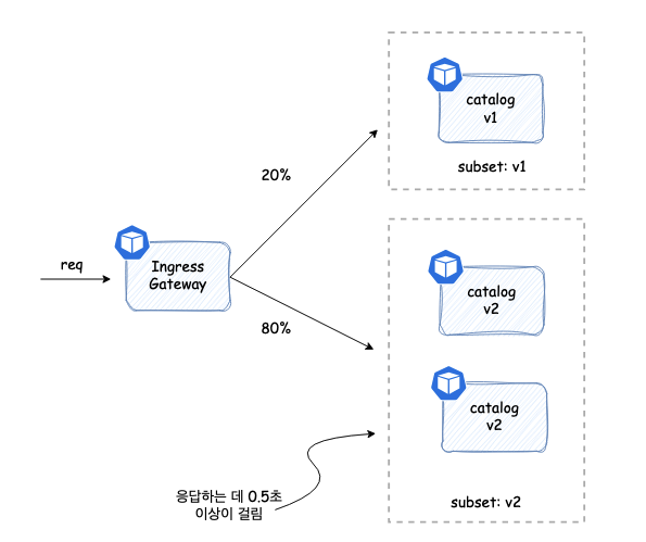 ์ธ๊ทธ๋ ์ค ๊ฒ์ดํธ์จ์ด๋ฅผ ํตํด์ ์์ฒญ์ด ๋ค์ด์ค๋ฉด ๊ฒ์ดํธ์จ์ด๋ v1 ๊ณผ v2 ์๋ธ์ ์ 2:8 ํ๋ฅ ๋ก ์์ฒญ์ ๋ผ์ฐํ ํฉ๋๋ค. ๊ทธ๋ฆฌ๊ณ catalog v2 ์ ํ ํ๋๋ ์๋ตํ๋ ๋ฐ 0.5์ด ์ด์์ด ๊ฑธ๋ฆฌ๋๋ฐ, ์ด๋ VirtualService ์์ ์ค์ ํ๋๋ก 0.5์ด ์ด์์ด ๊ฑธ๋ฆฌ๋ฉด ํ์ ์์์ด ๋ฐ์ํ๋์ง ํ ์คํธํ๊ธฐ ์ํจ์ ๋๋ค.