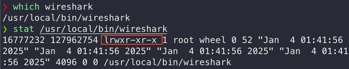 $ sudo ln -s /Applications/Wireshark.app/Contents/MacOS/Wireshark /usr/local/bin/wireshark