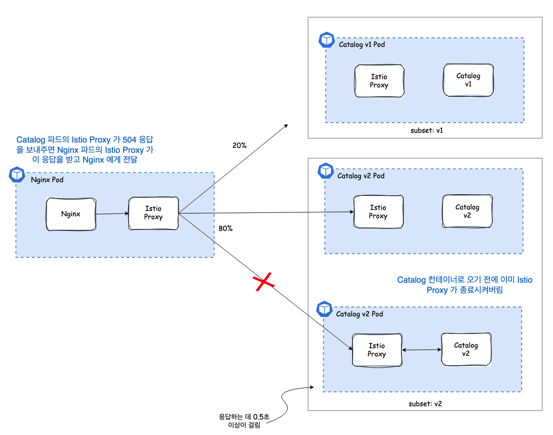 catalog ์ ํ๋ฆฌ์ผ์ด์ ๊ฐ์ ๊ฒฝ์ฐ๋ ์๋จ Istio Proxy ์์๋ถํฐ ์ปค๋ฅ์ ์ด ์ข ๋ฃ๋๊ธฐ ๋๋ฌธ์ 504 ์ ๊ดํ ์๋ต์ ๋ฐ์ ์ ์์ต๋๋ค.