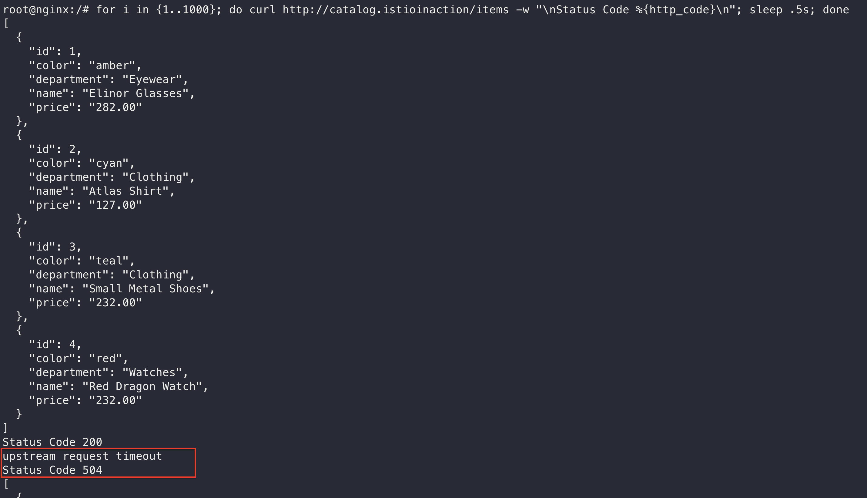 $ for i in {1..1000}; do curl http://catalog.istioinaction/items -w "\nStatus Code %{http_code}\n"; sleep .5s; done