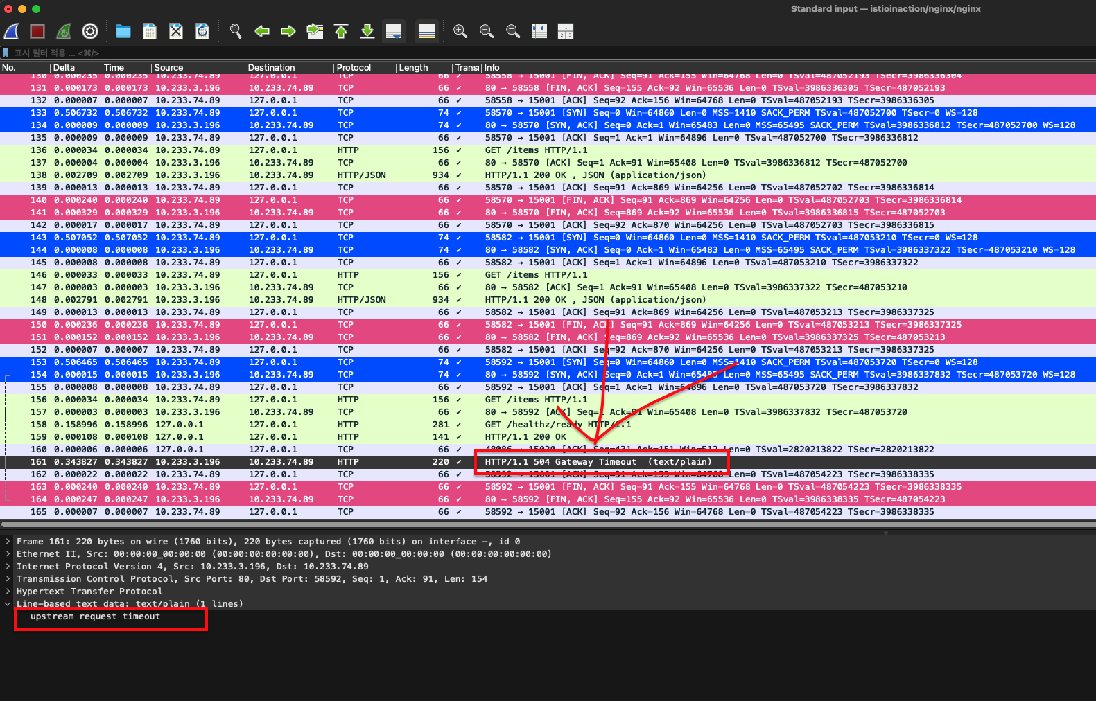 ๊ทธ๋ฆฌ๊ณ nginx ์ ํ๋ฆฌ์ผ์ด์ ์ Istio Proxy ๋ก๋ถํฐ ๋ฐ์ ์๋ต์ ๋ณธ์ธ ํ๋์ Istio Proxy ๋ก๋ถํฐ ์ ๋ฌ๋ฐ๊ธฐ ๋๋ฌธ์ ์๋ต์ ์บก์ฒํ ์ ์์์ต๋๋ค.