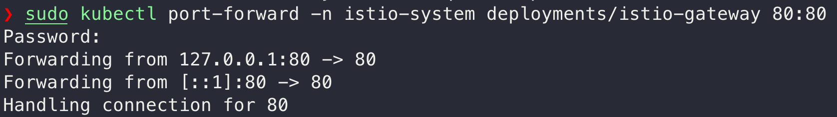 $ kubectl port-forward -n istio-system deployments/istio-gateway 80:80