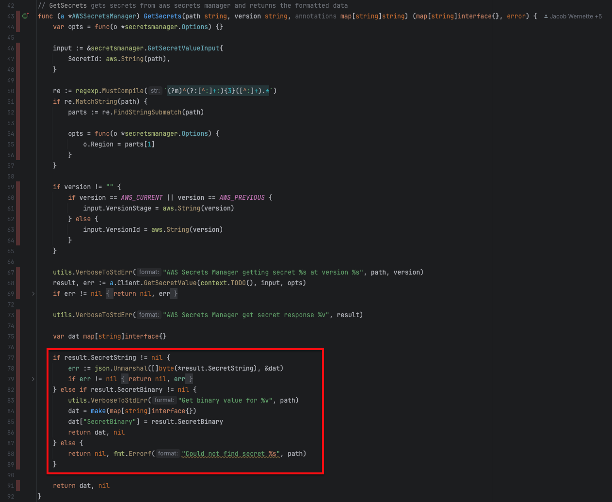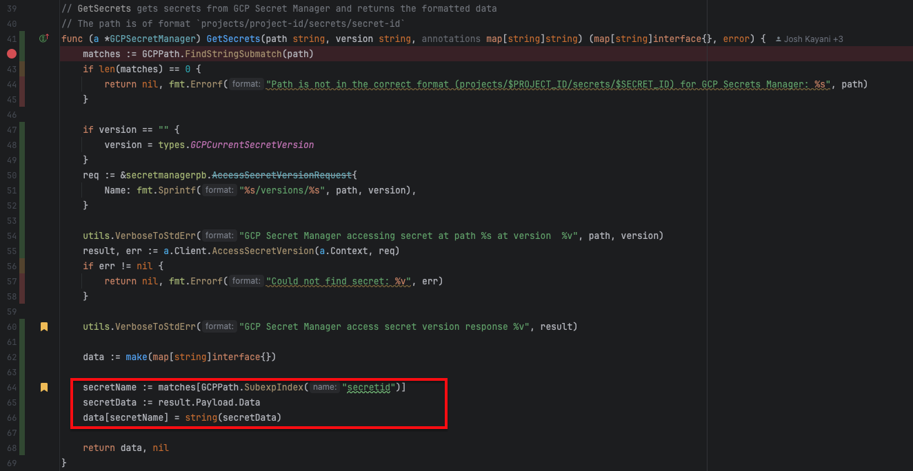 ๊ทธ๋ผ ๋์น์ ์ ํจ์ ์์ ์๋ a.GetSecrets ํจ์๊ฐ ์ต์ข ์ ์ผ๋ก ํต์ฌ ์ญํ ์ ํ๋ ํจ์์์ ์ ์ ์์ต๋๋ค.