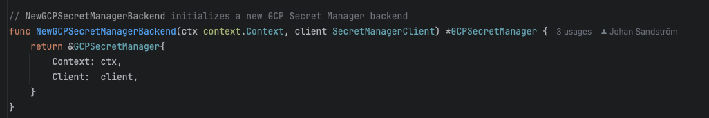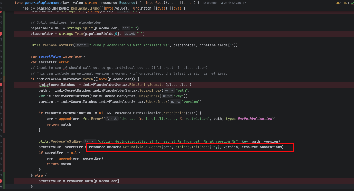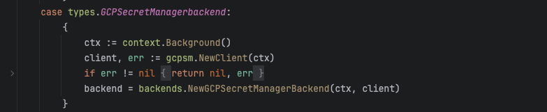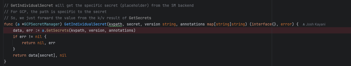 GCP ๊ฐ์ฒด์๋ Backend ์ธํฐํ์ด์ค ํจ์ ์ค ํ๋์ธ GetIndividualSecret ์ด ๊ตฌํ๋์ด ์๋ ๊ฑธ ํ์ธํ ์ ์์ต๋๋ค.