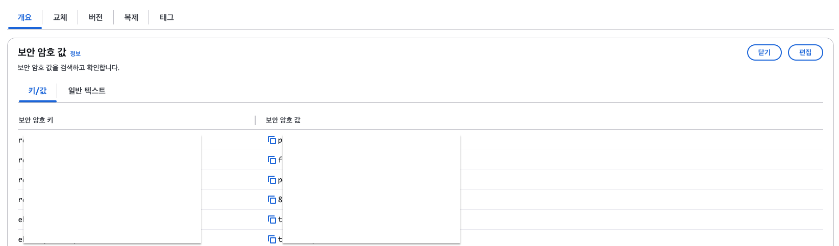 ๊ทธ๋์ ํ๋์ Secrets Manager ๋ฅผ ๋ง๋ค๊ณ , ๊ทธ ์์ ์ฌ๋ฌ ์ํฌ๋ฆฟ๋ค์ ์ ์ฅํด์ ์ฌ์ฉํ์ต๋๋ค.