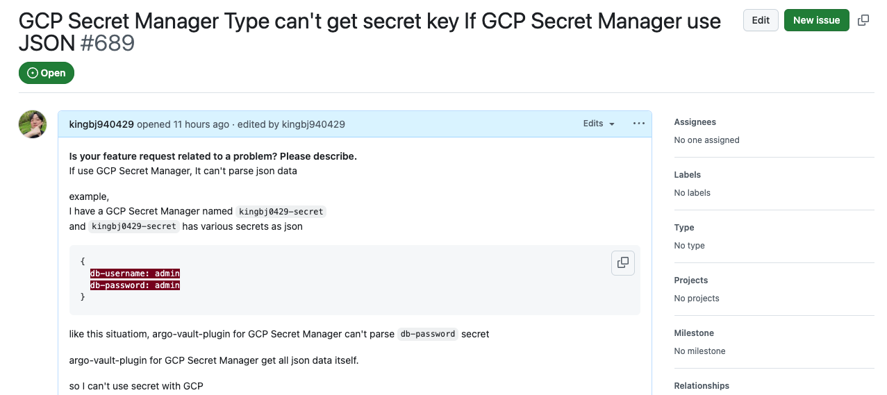 ๊ทธ๋์ Argo Vault Plugin Issue ์ ์ด ๋ฌธ์ ๋ฅผ ์์ฑํด๋์๊ณ , ์๊ฐ์ด ์์ผ๋ฉด ์ง์ Contribute ๋ฅผ ํ๋ฒ ์๋ํด๋ด์ผ๊ฒ ๋ค์. ์๊ฐ์ด ์์๋ผ๋..
