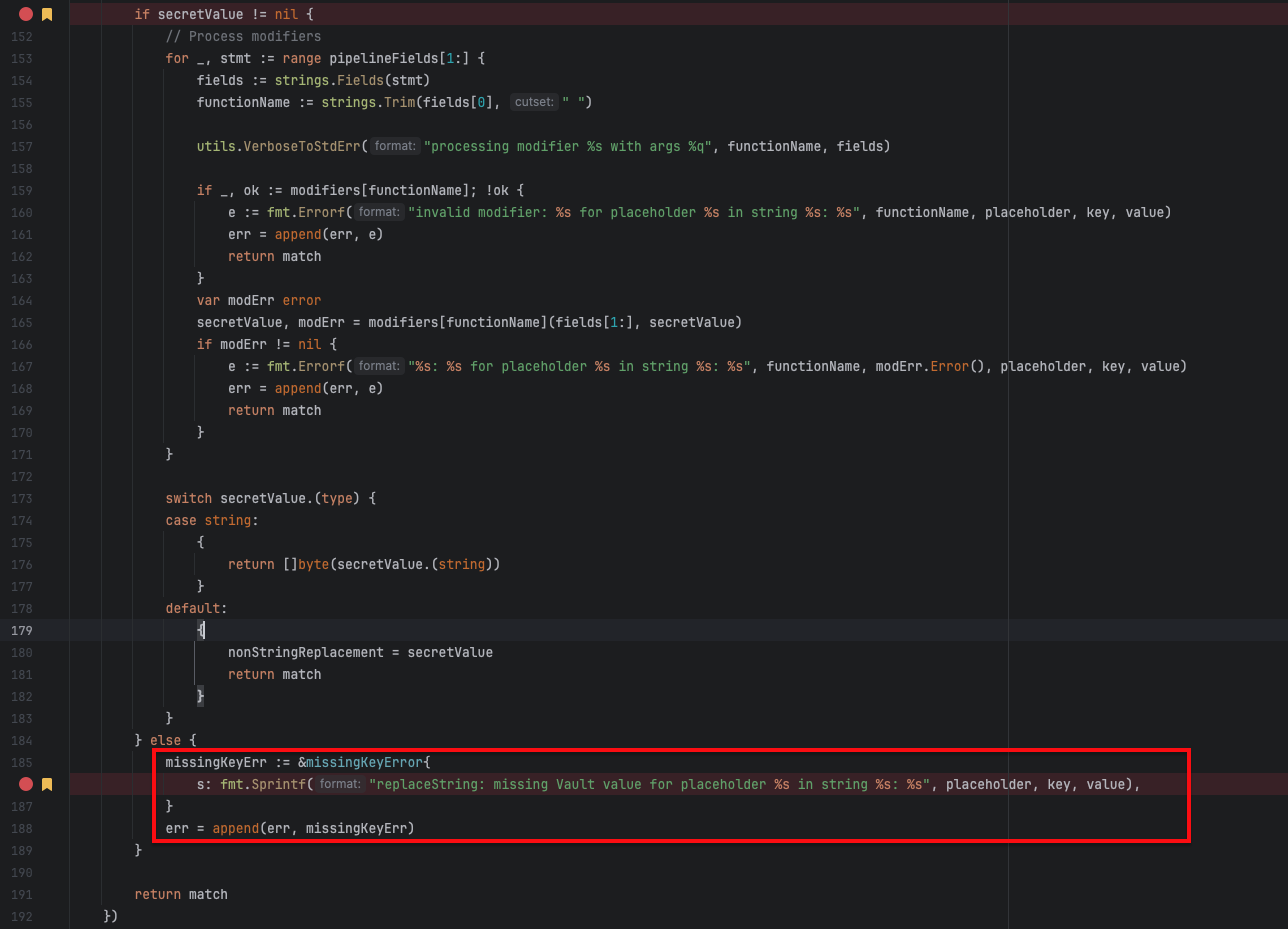 ์ฝ๋๋ฅผ ๋ณด๋ฉด secertValue ๊ฐ nil ์์ ๋ฐ๋ผ ๋ถ๊ธฐ์ฒ๋ฆฌ else ๋ก ์ค๋ฉด์ ์๋ฌ๊ฐ ๋ฐ์ํ๋ ๊ฒ์ ๋ณผ ์ ์์ต๋๋ค.