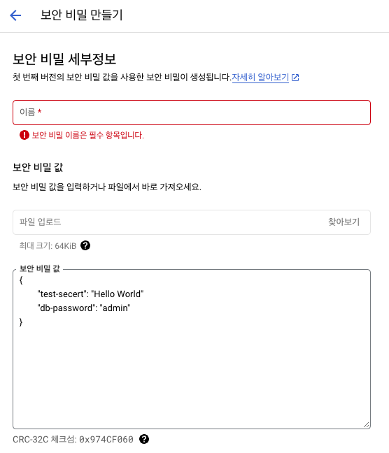 Secrets Manager ๋ฅผ ํ๋ ๋ง๋ค์ด ๊ทธ ์์์ ์ฌ๋ฌ ๊ฐ์ ์ํฌ๋ฆฟ์ JSON ์ผ๋ก ๊ด๋ฆฌํ ์ ์์๋, AWS ์ ๋ฌ๋ฆฌ GCP Secret Manager ๋ ํ๋์ Seceret Manager ๋จ์๊ฐ ์๋ ์ํฌ๋ฆฟ ํ๋ํ๋๋ฅผ ์์ฑํด์ ๊ด๋ฆฌํด์ผ ํ๋ ์ฐจ์ด๊ฐ ์์๋ ๊ฑฐ์ฃ .