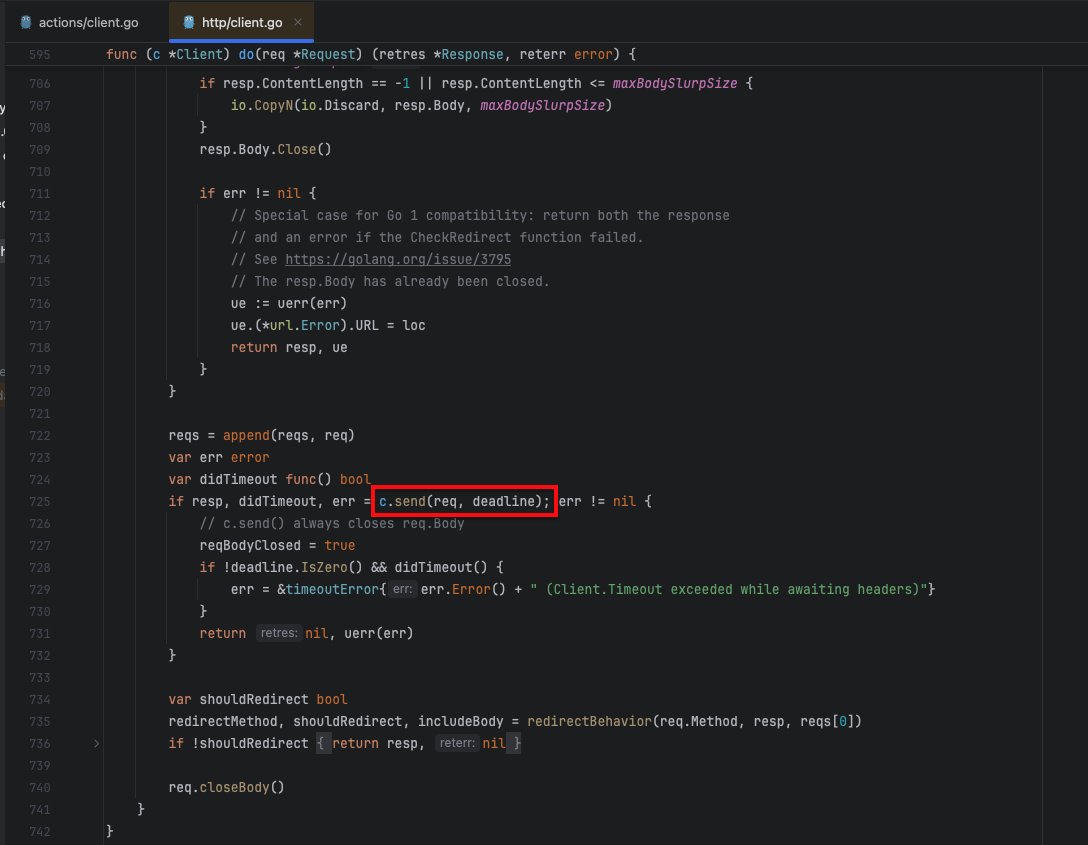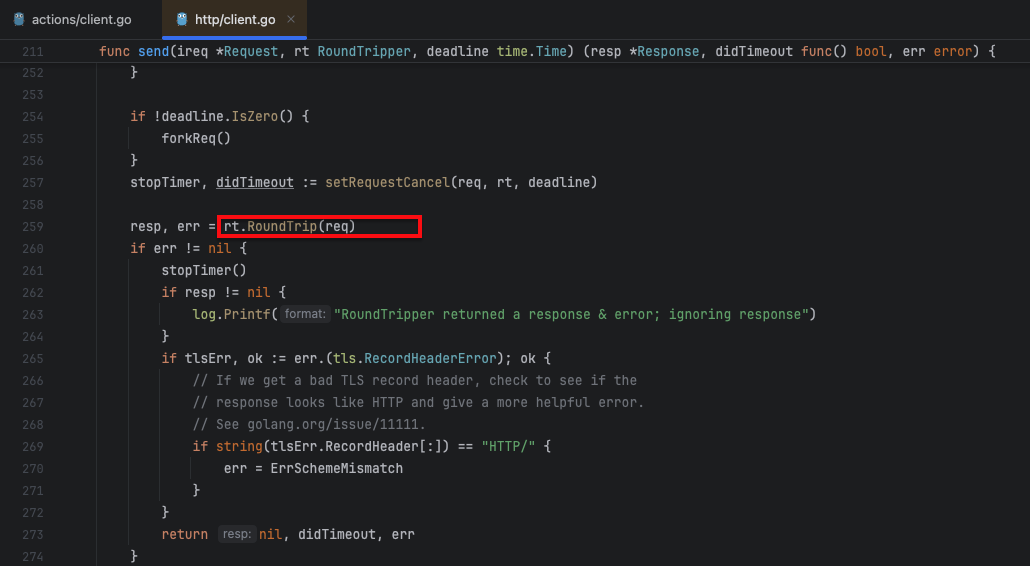 ๋ Send() ๋ฅผ ์ดํด๋ณด๊ฒ ๋๋ฉด, RoundTrip() ์ด๋ผ๋ ํจ์๊ฐ ์๋๋ฐ