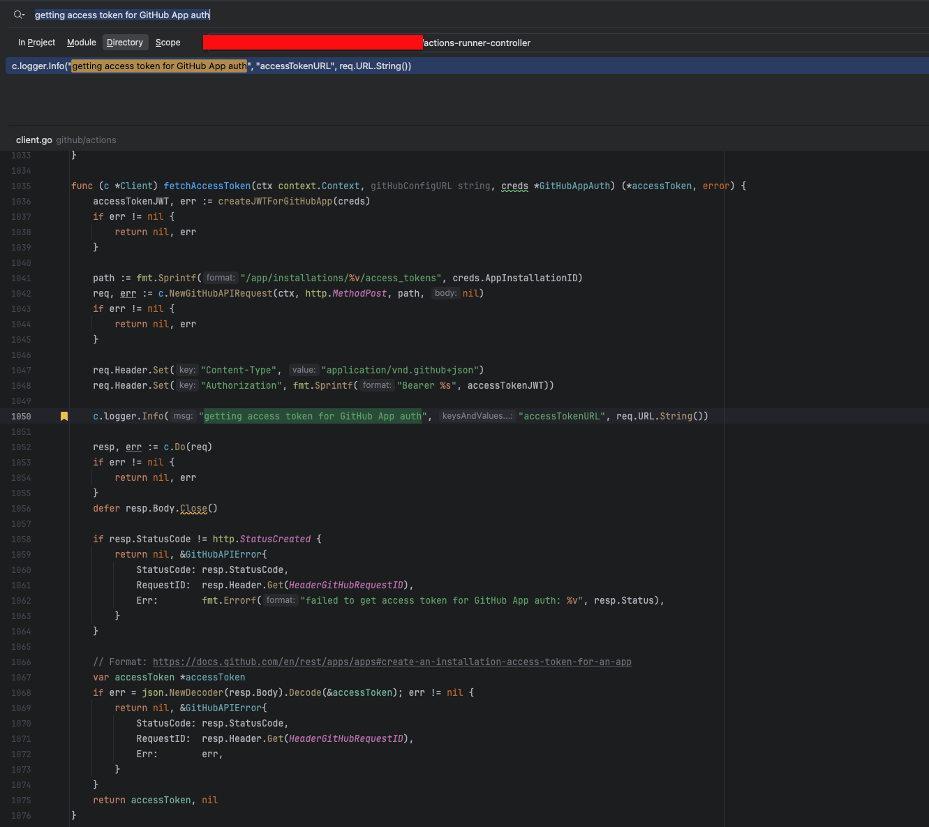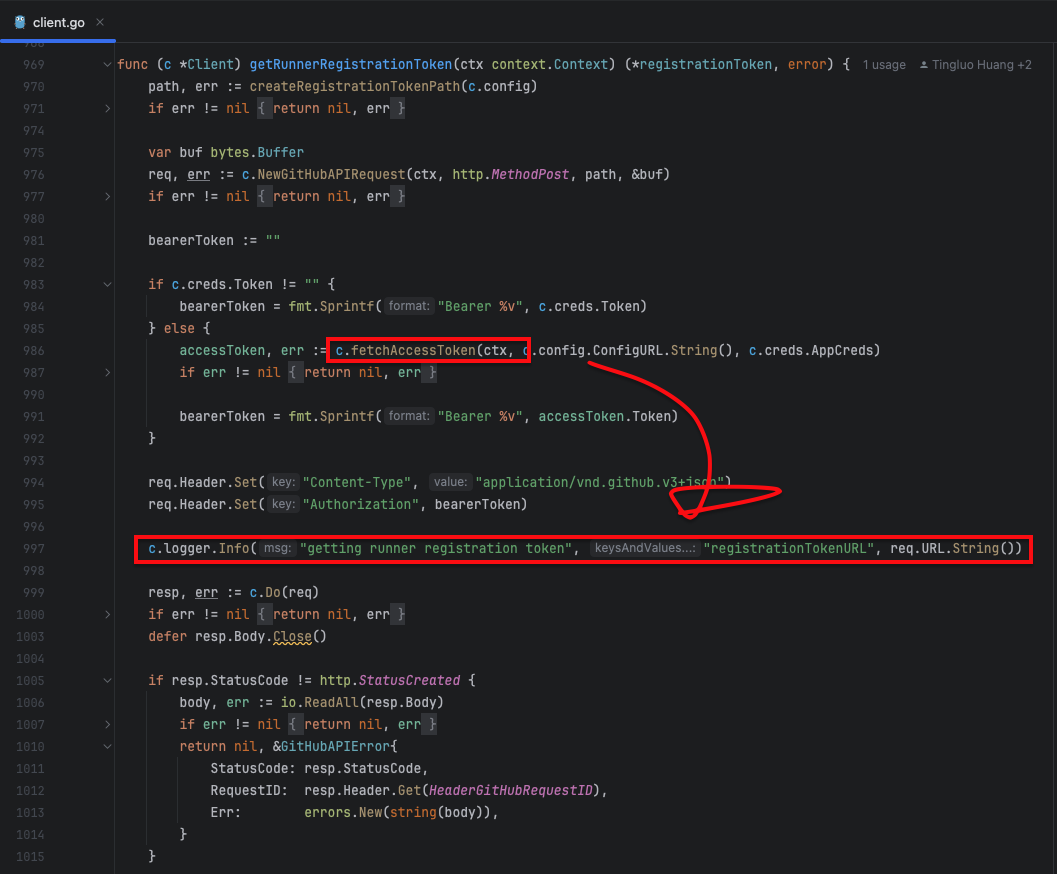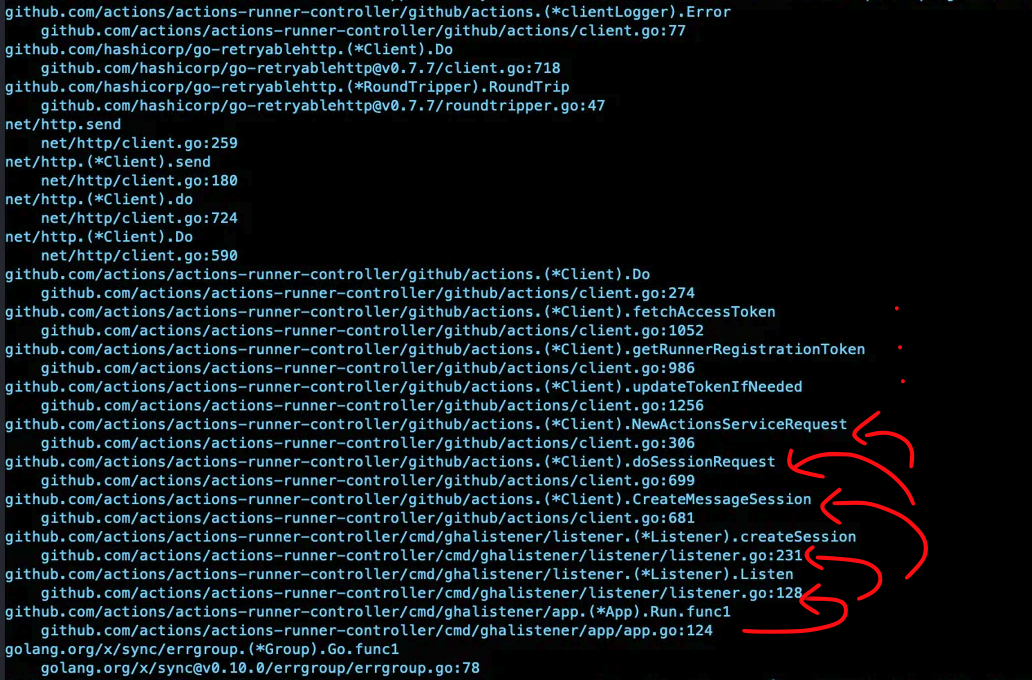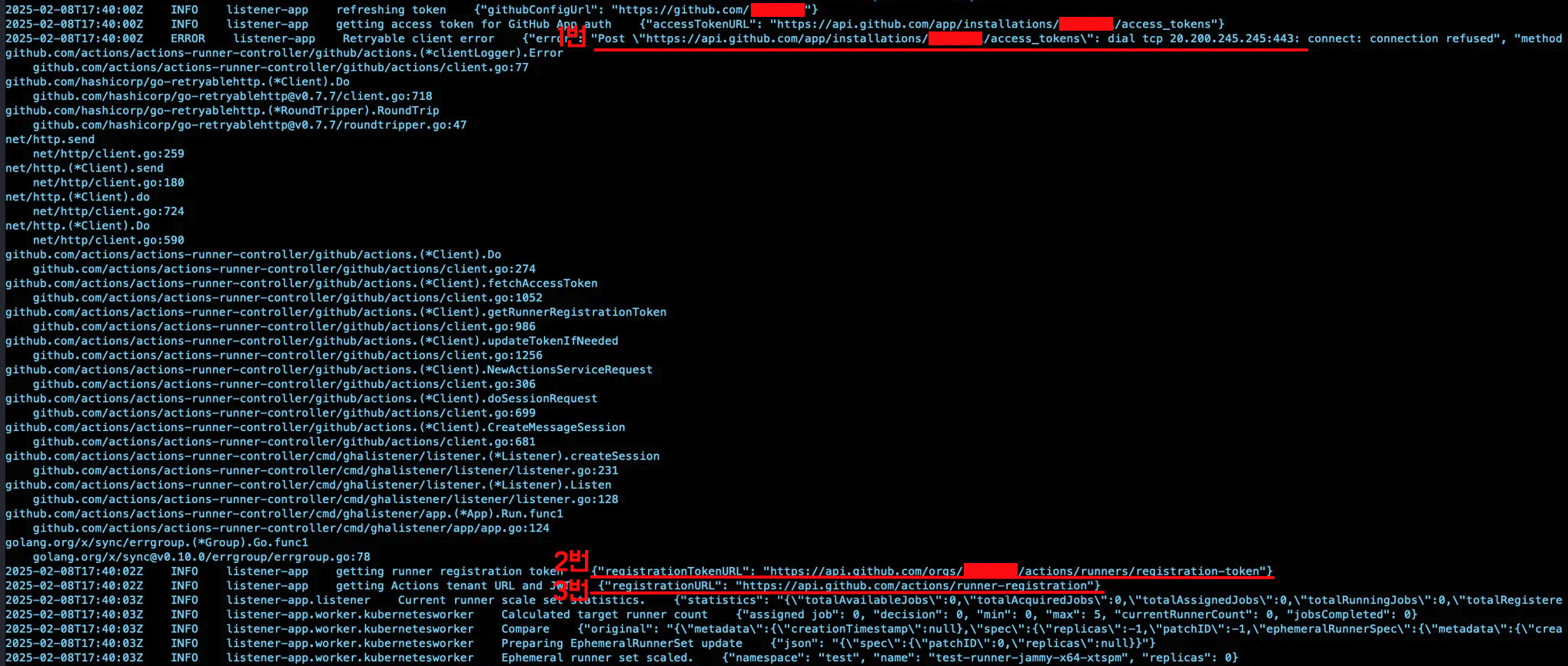 getting access token for GitHub App auth ๋ผ๋ ๋ก๊ทธ๋ c.fetchAccessToken ํจ์ ์์์ ๋ฐ์ํ๋ ๊ฒ์ด๊ณ , getting runner registration token ์ ์ด๋ฏธ์ง์์ ๋ณด์๋ค์ํผ ๋ฐ๋ก ๋ฐ์ ์ชฝ์์ ๋ฐ์ํ ๊ฑธ ์ ์ ์์ต๋๋ค.