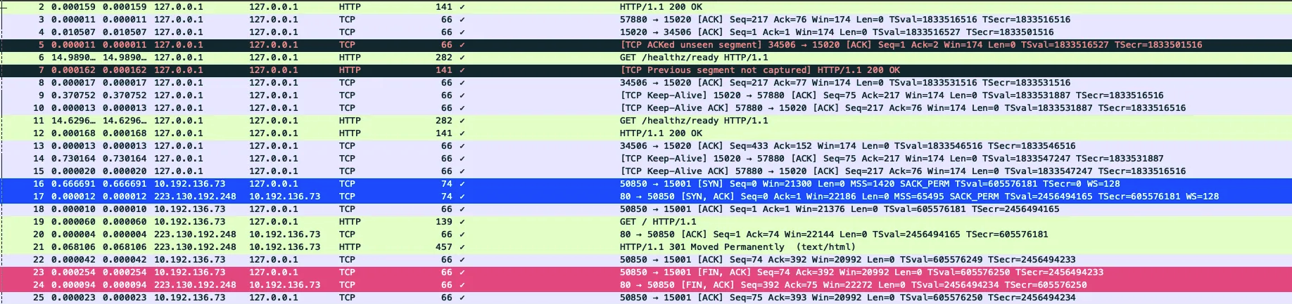 ์ด๊ฒ ๋ ํ์คํ ์๋ ค๋ฉด Nginx ์ปจํ ์ด๋๊ฐ ์๋ Istio Proxy ์ปจํ ์ด๋์์ ํจํท์ ์บก์ฒํ๋ ๊ฒ์ด ๋ ํ์คํ๋ฐ, ํธ์์ Nginx ์ปจํ ์ด๋๋ก ์งํํ์ต๋๋ค.