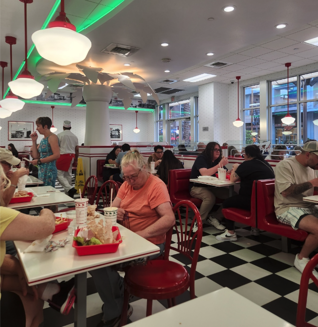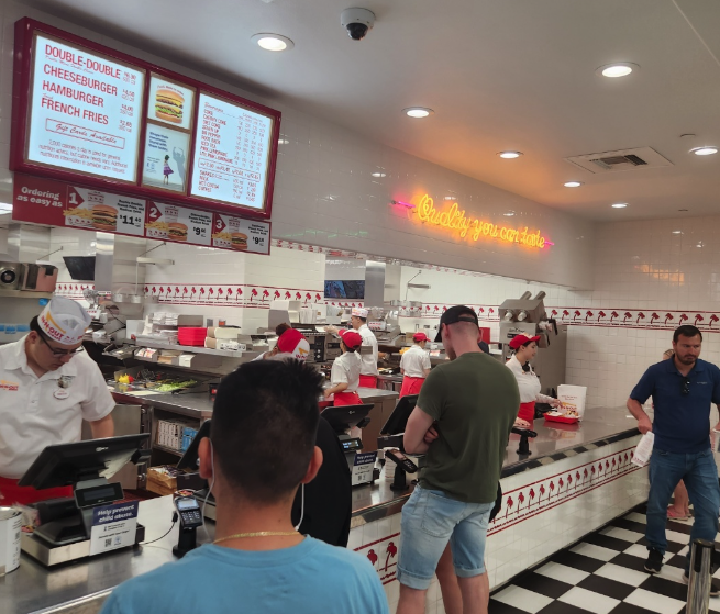 ์ดํ ํธํ ์ ๋์์์ ์ข ์ฌ์๋ค๊ฐ ์ ์ ๋ฅผ ๋จน๊ธฐ์ํด ์ธ์ค์์ ๋ฒ๊ฑฐ๋ก ํฅํ๋ค.