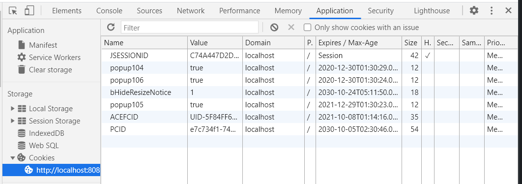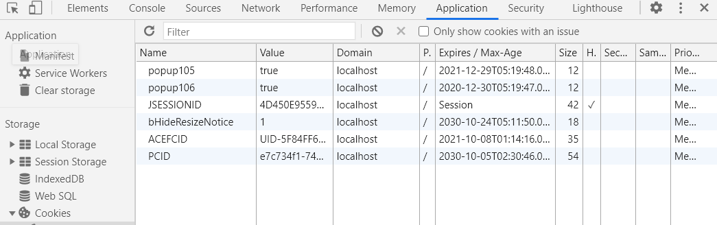 ๊ฐ๋ฐ์ ๋๊ตฌ Application ํญ์ ๊ฐ๋ณด๋ฉด ๋ธ๋ผ์ฐ์ ์ ์ ์ฅ๋์ด ์๋ ์ฟ ํค์ ์ ๋ณด๋ฅผ ๋ณผ ์ ์์ต๋๋ค.